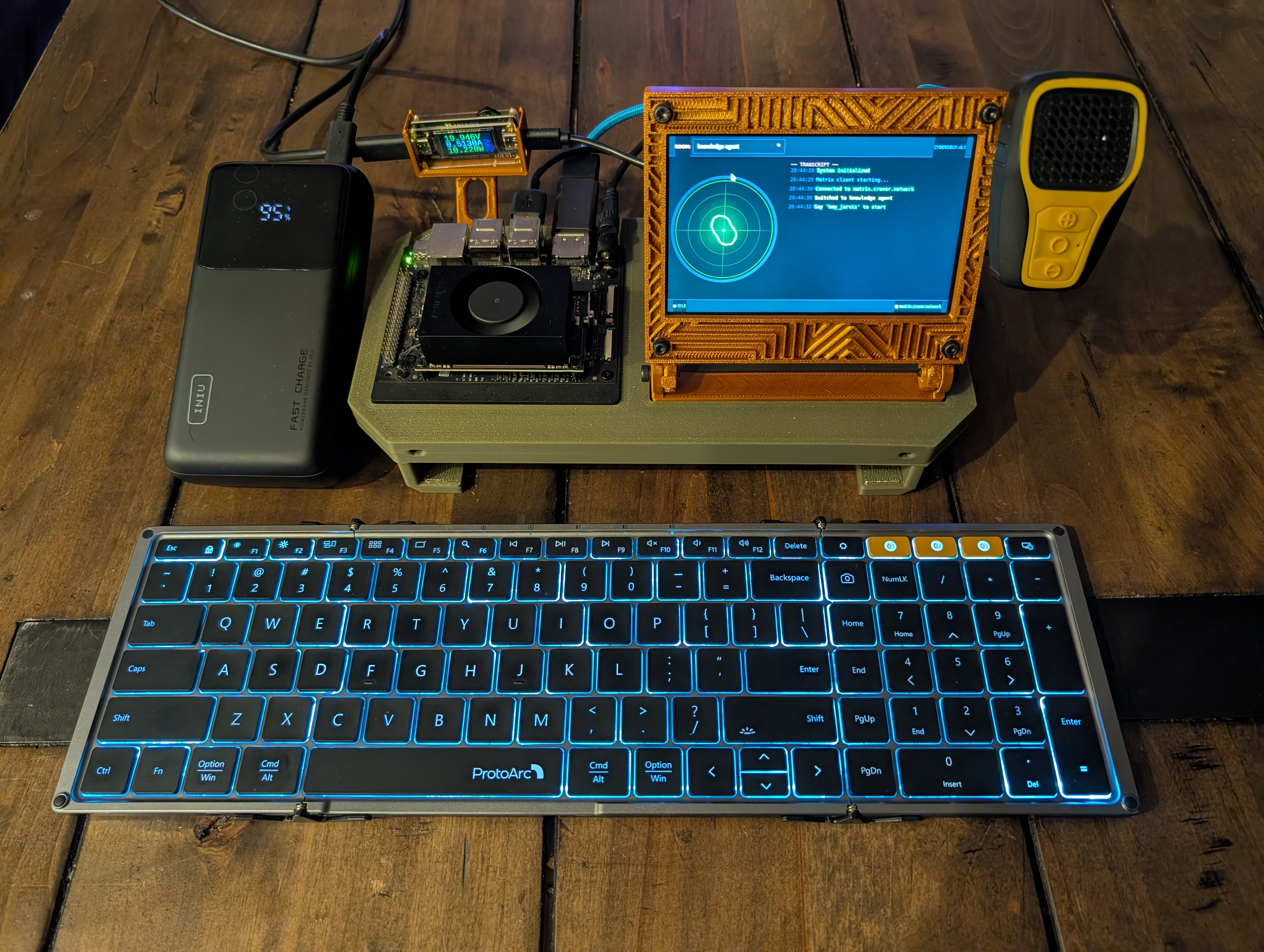 The cyberdeck with the keyboard stowed underneath. You can see the 3D printed enclosure, the oscilloscope display showing voice waveforms, the Jetson Orin Nano on the left, and the bluetooth speaker on the right.